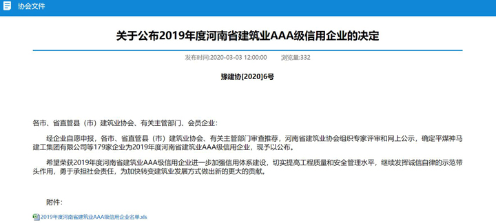 為進一步加強建筑企業(yè)信用體系建設,3月3日,河南省建筑業(yè)協(xié)會發(fā)布了《關于公布2019年度河南省建筑業(yè)AAA級信用企業(yè)的決定》,山河集團河南公司榜上有名,這也是河南公司首次上榜。