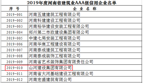 [河南公司]山河集團河南公司上榜河南省2019年度建筑業(yè)AAA級信用企業(yè)