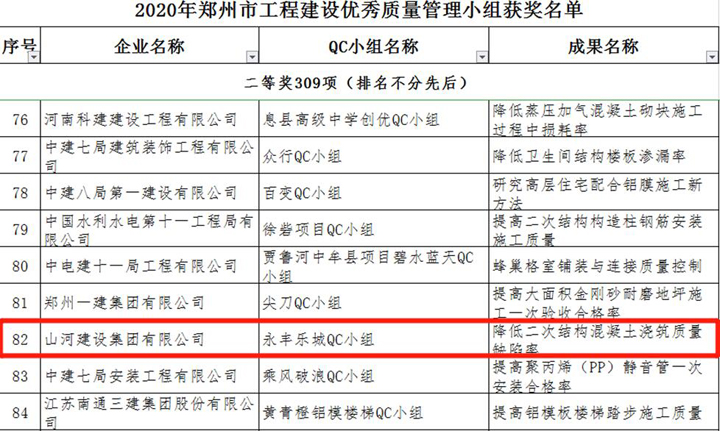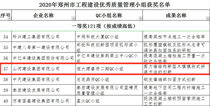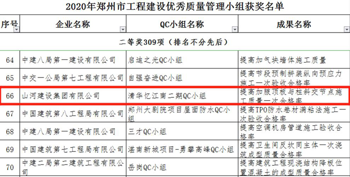 3月23日,鄭州市建筑業(yè)協(xié)會(huì)發(fā)布《關(guān)于表彰2020年鄭州市工程建設(shè)優(yōu)秀質(zhì)量管理小組活動(dòng)成果的通知》,山河建設(shè)集團(tuán)河南公司申報(bào)的三項(xiàng)成果榜上有名,恒大珺睿府二期QC小組獲得一等獎(jiǎng),清華憶江南二期QC小組、永豐樂(lè)城QC小組分別獲得二等獎(jiǎng)。