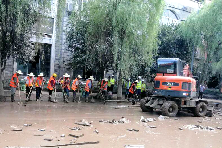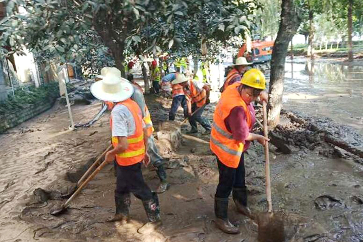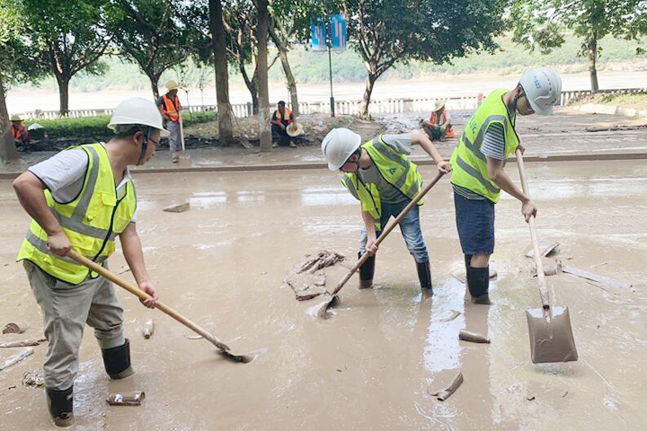 8月19日至20日,“長江2020年第5號洪水”“嘉陵江2020年第2號洪水”陸續(xù)通過重慶主城區(qū),巴南區(qū)魚洞江濱路、巴濱路、木洞、李家沱等低洼地區(qū)受災(zāi)嚴(yán)重。山河建設(shè)集團(tuán)西南公司碧桂園巴南工貿(mào)園項(xiàng)目部主動請纓,組織管理人員及工人成立了一支道路清淤志愿隊(duì),積極投入到救災(zāi)工作中。