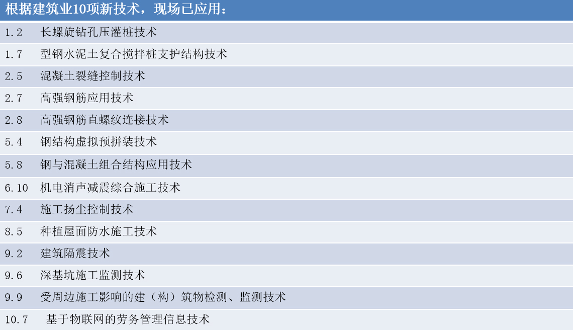 開工伊始,項(xiàng)目部建立了新技術(shù)應(yīng)用管理體系,從組織上保證新技術(shù)推廣應(yīng)用順利實(shí)施,同時(shí)根據(jù)現(xiàn)場(chǎng)實(shí)際情況把新技術(shù)應(yīng)用項(xiàng)目進(jìn)行分解,落實(shí)至班組,責(zé)任到人。施工過程中,該項(xiàng)目先后應(yīng)用了長(zhǎng)螺旋鉆孔壓灌樁技術(shù)、型鋼水泥土復(fù)合攪拌樁支護(hù)結(jié)構(gòu)技術(shù)、混凝土裂縫控制技術(shù)、高強(qiáng)鋼筋應(yīng)用技術(shù)等十余項(xiàng)建筑業(yè)新技術(shù)。海南公司工程部定期到現(xiàn)場(chǎng)進(jìn)行檢查、驗(yàn)收和指導(dǎo),確保新技術(shù)應(yīng)用落到實(shí)處,見到實(shí)效。