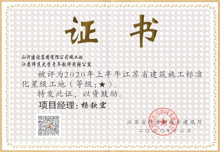 近日,從江蘇省住房和城鄉(xiāng)建設(shè)廳傳來喜訊,山河建設(shè)集團(tuán)江蘇公司承建的江蘇師范大學(xué)青年教師周轉(zhuǎn)公寓工程被評為“2020年上半年江蘇省建筑施工標(biāo)準(zhǔn)化星級工地”,再添一項(xiàng)省級榮譽(yù)。