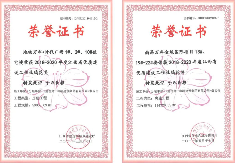 近日,江西省住房和城鄉(xiāng)建設(shè)廳發(fā)布《關(guān)于表彰2018-2020年度江西省優(yōu)質(zhì)建設(shè)工程獎(jiǎng)獲獎(jiǎng)工程的通報(bào)》,山河建設(shè)集團(tuán)江西公司承建的地鐵萬科·時(shí)代廣場(chǎng)、萬科金域國(guó)際項(xiàng)目雙雙獲得江西省優(yōu)質(zhì)建設(shè)工程杜鵑花獎(jiǎng)。