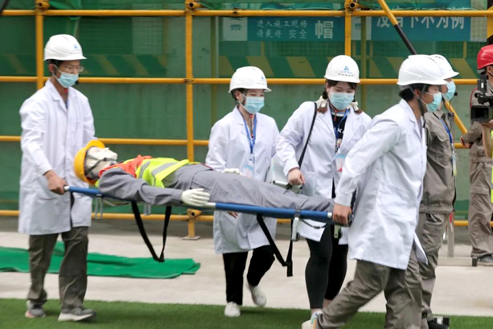 項目經(jīng)理發(fā)出指令,立即啟動應(yīng)急救援預(yù)案,同時撥打120求助,并向上級單位報告。警戒隔離組、搶險救援組、醫(yī)療救護組先后進入事發(fā)區(qū)域,拉設(shè)警戒區(qū),檢查傷者情況并進行初步包扎處理,撤離作業(yè)人員,將傷者抬上擔架送上救護車,一系列行動有力有序,“受傷工人”得到了及時救治。