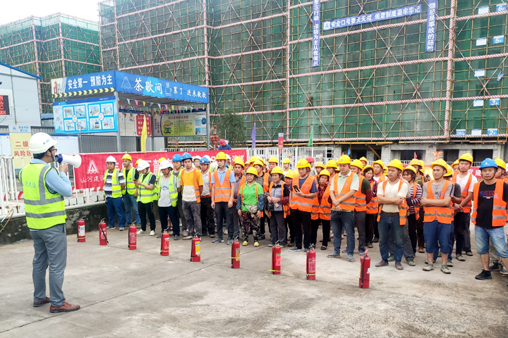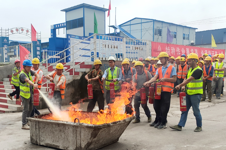 活動現(xiàn)場,項目管理人員、勞務(wù)施工人員整齊列陣,相關(guān)負責(zé)人講解了有關(guān)火災(zāi)現(xiàn)場的應(yīng)急處置方案,滅火器的原理、基本操作方法、注意事項等。演練人員按照預(yù)案,使用水槍、滅火器對“起火點”進行滅火操作,熟練掌握了消防器材的使用方法。