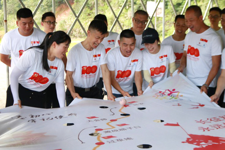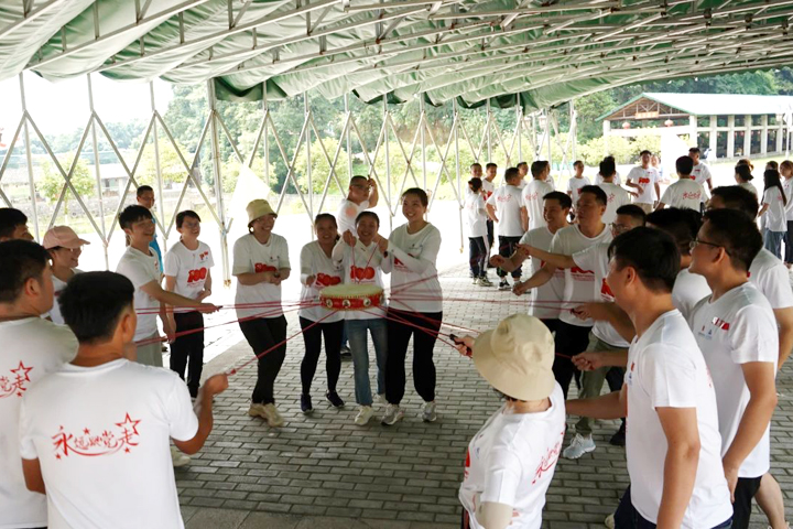 接下來,大家同聲齊唱《沒有共產(chǎn)黨就沒有新中國》,嘹亮的歌聲盡顯豪邁氣勢,燃起濃濃的愛國熱情。參訓人員分成6隊,并制定了隊歌、隊徽、隊旗、隊伍造型,正式開始比拼。在“長征”拓展訓練中,隊員們再一次熟悉了黨史,感受長征之路的曲折艱難,重溫新中國成立以來的重大事件,激發(fā)了奮勇爭先的干事創(chuàng)業(yè)熱情。