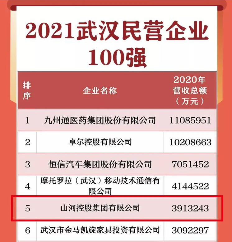 8月26日,“2021武漢民營(yíng)企業(yè)100強(qiáng)”排序榜正式發(fā)布,山河集團(tuán)名列榜單第5位,穩(wěn)居第一方陣。