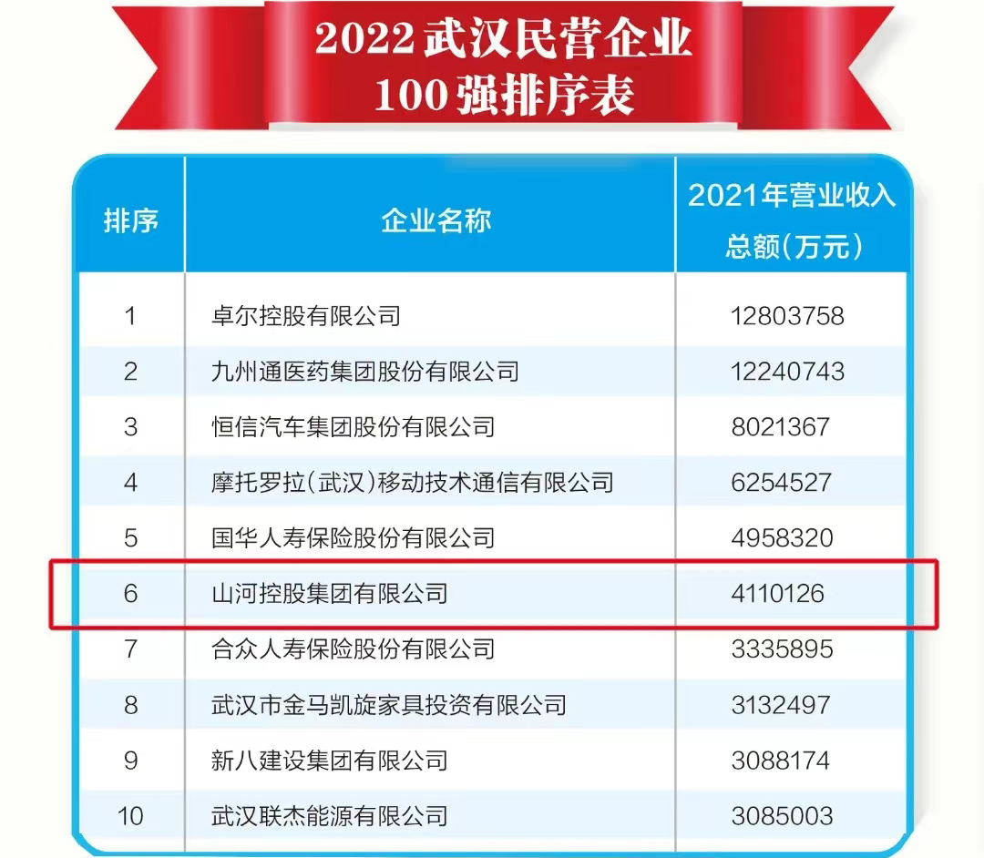 8月19日,2022武漢民營(yíng)企業(yè)100強(qiáng)、民營(yíng)制造業(yè)企業(yè)50強(qiáng)發(fā)布會(huì)暨金融服務(wù)民營(yíng)企業(yè)高質(zhì)量發(fā)展大會(huì)在武漢會(huì)議中心召開。大會(huì)發(fā)布的“2022武漢民營(yíng)企業(yè)100強(qiáng)”榜單上,山河集團(tuán)名列第6位。